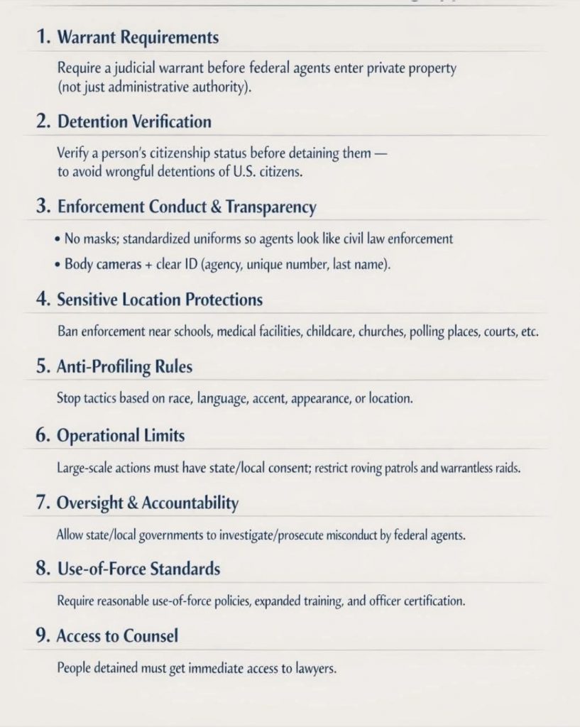 No masks; standardized uniforms so agents look like civil law enforcement (not cartel/gestapo/carjacking looking… terrorizing communities). Body cameras + clear ID (agency, unique number, last name). - Sensitive Location Protections